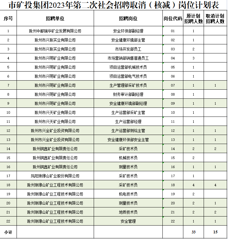 根據(jù)《滁州市興滁礦業(yè)投資集團(tuán)有限公司2023年第二次社會(huì)招聘公告》規(guī)定,經(jīng)對(duì)各崗位報(bào)名情況篩查審定,結(jié)合資格復(fù)審情況,部分崗位報(bào)名情況未達(dá)到開考比例,經(jīng)研究決定取消以下崗位招聘計(jì)劃: