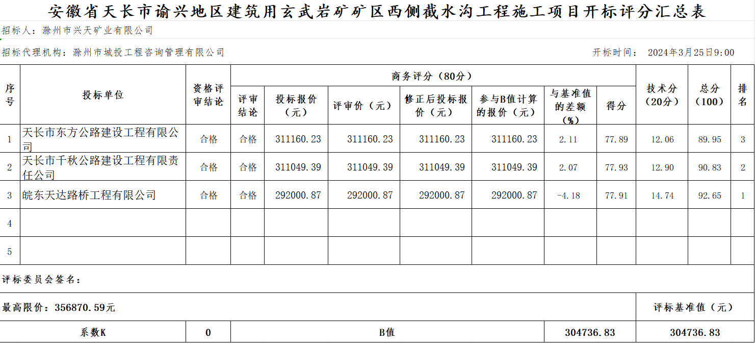 安徽省天長(zhǎng)市諭興地區(qū)建筑用玄武巖礦礦區(qū)西側(cè)截水溝工程施工項(xiàng)目中標(biāo)候選人公示