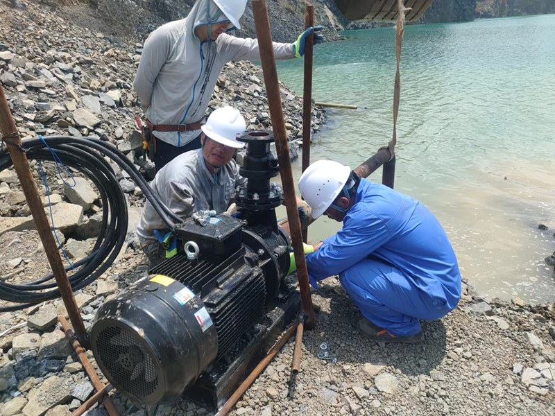 抗旱方案有了,可是要想把水從70米深的礦坑內(nèi)抽到地面,不但需要揚(yáng)程特別高的水泵,還需要高規(guī)格長距離的水管和電纜,還有很多配套零部件要采購。旱情就是命令,抗旱就是責(zé)任,興天礦業(yè)副總經(jīng)理趙崗牽頭落實(shí)抗旱物資采購,親自指揮設(shè)備調(diào)運(yùn)安裝,帶領(lǐng)公司抗旱突擊隊(duì)和社區(qū)干部深入礦坑,一起研究水泵需要多大功率安裝在什么地方、水管需要多粗從哪里下放、電纜需要多長從哪里接電等問題。方案制定好了,老百姓的水稻不能等,挖掘機(jī)第一時(shí)間進(jìn)場(chǎng)整理場(chǎng)地,興天礦業(yè)和社區(qū)準(zhǔn)備的水泵、水管電纜等也迅速到位,抗旱突擊隊(duì)與社區(qū)干部群眾一起與時(shí)間賽跑,從早到晚緊張施工,一心想著的就是早點(diǎn)把水抽上去,盡量把旱情影響降到最低。
